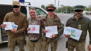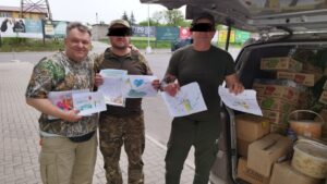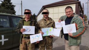 Напередодні Пасхи, яку святкували в Україні за православним обрядом на початку травня, ми привезли багато дитячих малюнків, які хлопці залюбки беруть і потім рясно прикрашають ними свій військовий побут… Дитячі малюнки, де б ми їх не пропонували, скрізь військові з щирою посмішкою брали і дякували за участь дітей в підтримці захисників.