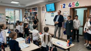 Першокласники вирішили познайомитися з гостем, розпитати про його щоденну роботу на такій відповідальній посаді. Пан Славомір охоче розповів про своє життя.