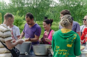 На зустрічі були присутні переселенці з Донецької та Луганської областей, сім’ї з Криму і майже весь склад Церковної Ради «Общини Доброго Пастиря» зі своїми сім’ями, а так само молоді брати, які служили водіями й помічниками в організації пікніка. Сім’ї Андрія Павловича і Вови Чекеренди подбали про приготування їжі. Коли ми під’їжджали до бази, звідти вже доносилися смачні запахи гриля. Був час для знайомства, коли представник кожної сім’ї міг коротко розповісти про себе і свою сім’ю. Все відбувалося просто і невимушено. Микола Нікітін приготував для нас проповідь на текст з книги пророка Єремії 29 розділ. У проповіді він постарався відповісти на питання, з якими стикається кожен біженець «Хто ми: боягузи, зрадники, як нас іноді називають знайомі, що залишилися в зоні АТО та на окупованих територіях, чи люди, які вчинили розсудливо? Як не впасти в депресію, а жити повноцінним життям Божих дітей, опинившись в числі переселенців? »