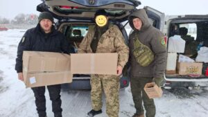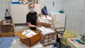 Our friends and partners from the “ABEJ-TOUR” association in Tours, France, donated many boxes of medical supplies for first aid in the hospital, and we handed these boxes over to the doctors. At first, we were told that the hospital was fully stocked and that they would not take anything, but when we opened the boxes, it turned out that they contained very high-quality materials, bandages, anti-burn plasters, and many other very necessary items, so they accepted all of this with gratefulness and took it to the operating room.