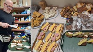 The next stage was to feed the soldiers. Brother Mykhailo did not leave this slicing machine. He sliced so much that it was not clear until the end what was thicker in the sandwich: bread, cheese, or sausage, so that the men truly felt our love and care. Also in the photo, you can see a bunch of homemade pies, thanks to all those who prepared them. In the first days, they were all taken away by soldiers in a flash, so that none were left, because it’s homemade!